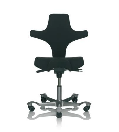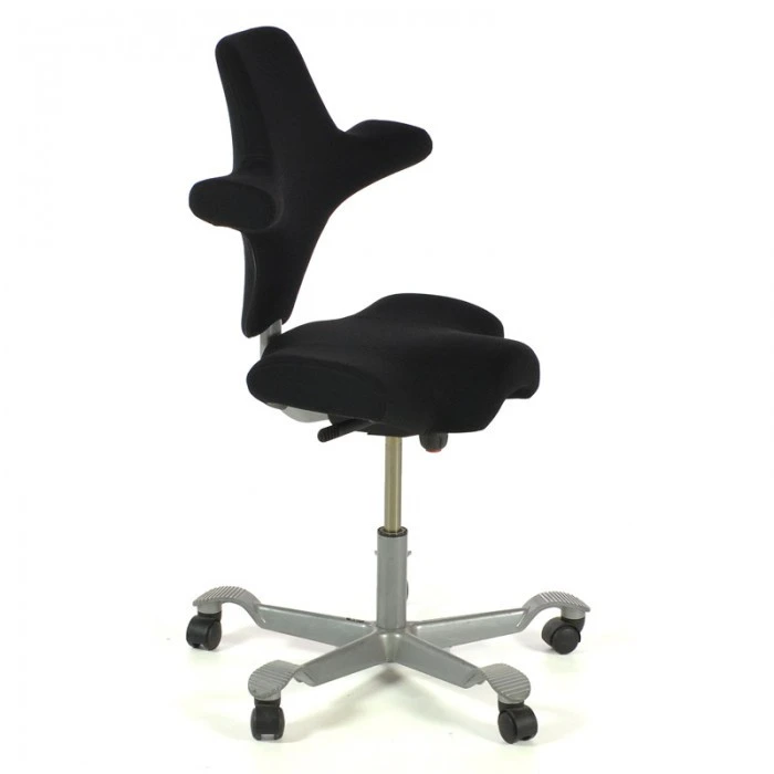 HÃ…G Capisco 8106 is delivered with a seat and back. The saddle seat can be adjusted between low and high working positions, all the way up to standing, enabling you to be more dynamic in your movements while still balanced. The seat height, seat depth and back height can be adjusted. Tilt resistance is adjustable and lockable. The foot base is delivered in silver-lacquered aluminium. Standard 200 mm gas lift. Also available in vinyl upholstery and a range of other finishes, including a black star base. Other optional extras include headrest and a step-up footrest.