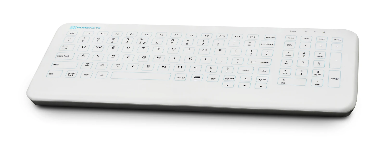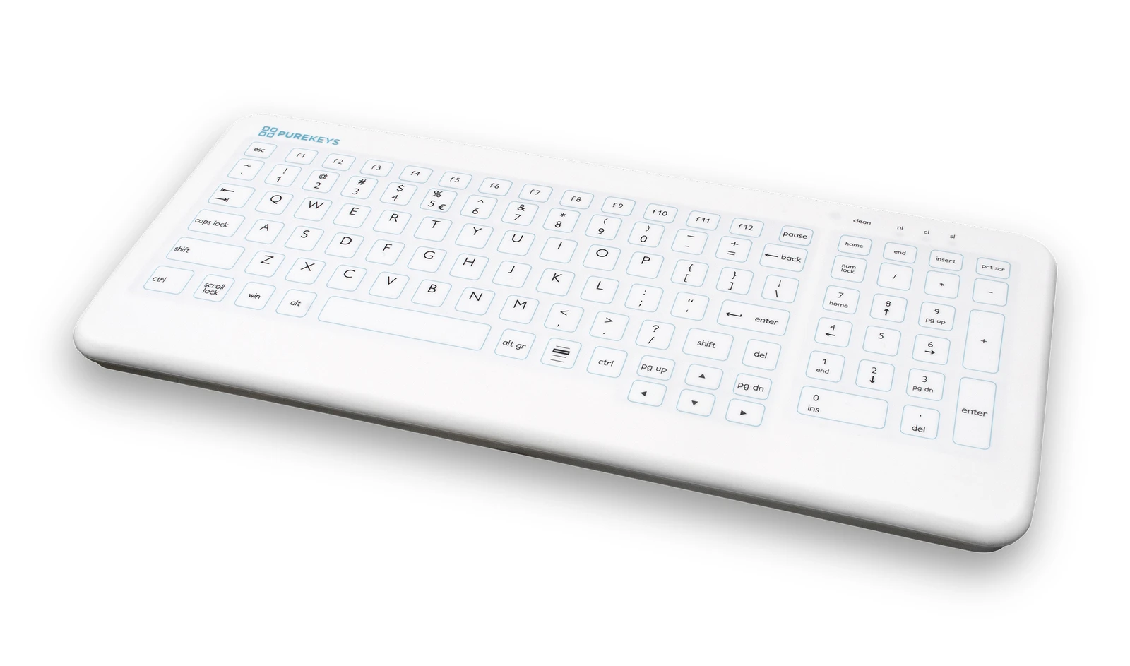 All Purekeys medical keyboards combine a completely flat top with the tactile feedback of a normal keyboard.